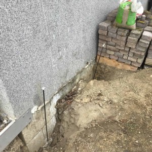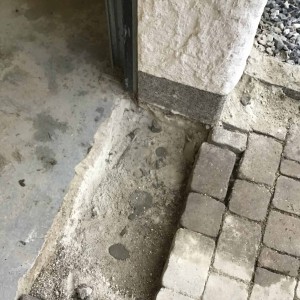 AUSGANGSITUATION UND SETZUNGSURSACHE: Die Garage setzt sich bis auf 3,5 cm vom Wohnhaus. Die ersten Risse bzw. Setzung koennten vor ca. 7/8 Jahren beobachtet werden. In der letzten Periode verschlimmert sich die Situation.