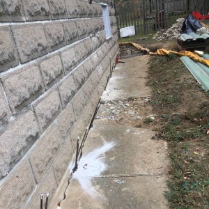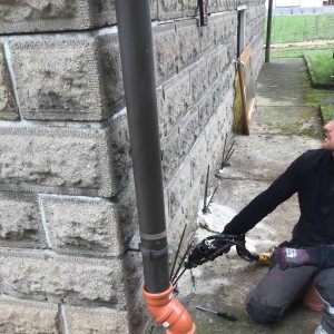 Setzungsursache und Ortung: Setzung der Ost Ecke des Gebaeudes. Ursache der Setzung liegt bei einer Unterspuelung des Baugrunds durch eine defekte Regenwasserableitung.
