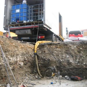 Festigen heißt im geotechnischen Begriff, dass mechanische Verhalten des Volumens des betreffenden Bodens zu verbessern, indem man die Spannkraft für die Last an der Oberfläche erhöht. Mit der Festigung des Bodens packt man das Problem direkt an seinen Wurzeln und vermeidet so weitere und gefährliche Senkungen des Bodens, die sich auch in einigen Fällen auf die Benutzbarkeit des Gebäudes auswirken können. Die beste Lösung zur Festigung des Bodens ist die Injektion von sich ausdehnendem Kunstharz, die den Boden festigt, anhebt und ebnet. In besonders schweren Fällen löst eine gemischte Technik von Harz und Mikropfählen gemeinsam das Problem der Absenkung. Das Harz festigt die Bodenschicht unter dem Fundament und füllt eventuelle Hohlräume, indem es den Boden komprimiert und auch um 20-30 cm hebt, bis man wieder eine Ebene erreicht. Die Mikropfähle hingegen erlauben es die strukturelle Last der oberen Bodenschichten in die tieferen, widerstandsfähigeren und weniger komprimierbaren Bodenschichten zu verlagern. Die Ausführungsphase sieht die Herstellung von Bohrlöchern mit einem Durchmesser von circa 12/14 Millimetern vor, deren Abstand zuvor festgelegt wurde. Durch die Bohrlöcher im Boden werden kleine Injektionsrohre aus Stahl geführt durch die das Harz injiziert wird. Während der Injektionsphase ist das Harz flüssig und kann so durch den Druck der Injektionspumpen in den Boden eindringen.