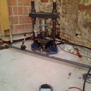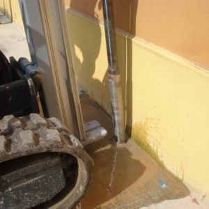 Danach führt man den Mikropfahl MP60 durch das mittlere Bohrloch. Die Rohrelemente, aus denen der Mikropfahl MP60 besteht, werden mit einem speziellen, widerstandsfähigen Stahlgewinde zusammengeschraubt und durch den Druck, ausgeübt durch einen hydraulischen Bock, in den Boden eingebracht (Fixierkraft bis zu 250 kN).